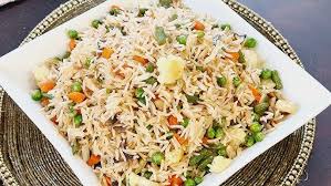 Seasoned rice cooked with carrots, onions, and mixed vegetables. Vegan option.